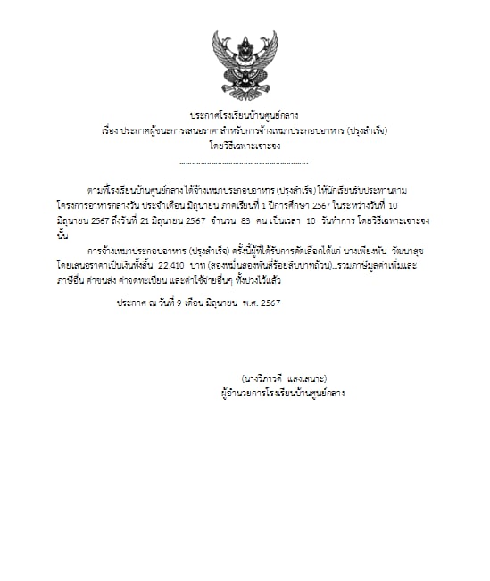 ประกาศผู้ชนะการเสนอราคาสำหรับการจ้างเหมาประกอบอาหาร โดยวิธีเจาะจง งวดที่ 1 ประจำเดือน มิถุนายน 2567