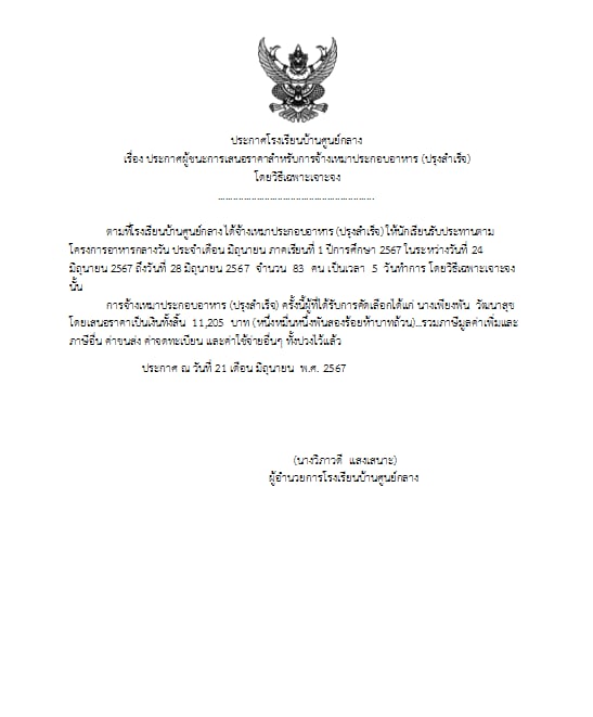 ประกาศผู้ชนะการเสนอราคาสำหรับการจ้างเหมาประกอบอาหาร โดยวิธีเจาะจง งวดที่ 2 ประจำเดือน มิถุนายน 2567