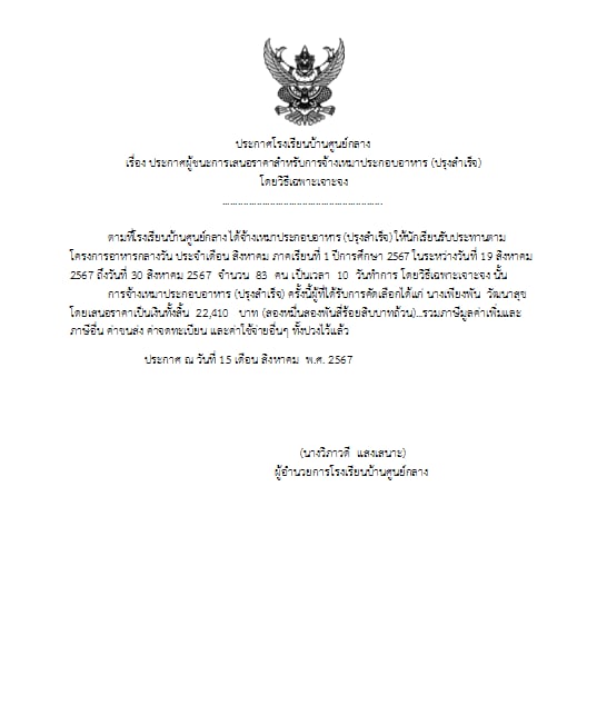ประกาศผู้ชนะการเสนอราคาสำหรับการจ้างเหมาประกอบอาหาร โดยวิธีเจาะจง งวดที่ 1 ประจำเดือน สิงหาคม 2567