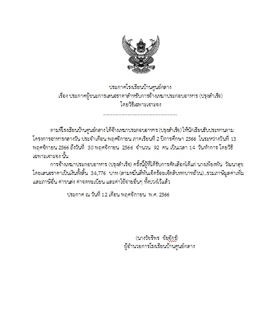 ประกาศผู้ชนะการเสนอราคาสำหรับการจ้างเหมาประกอบอาหาร โดยวิธีเจาะจง งวดที่ 1 ประจำเดือน พฤศจิกายน 2567