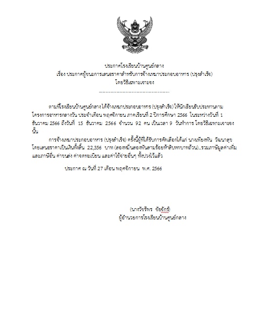 ประกาศผู้ชนะการเสนอราคาสำหรับการจ้างเหมาประกอบอาหาร โดยวิธีเจาะจง ประจำเดือน ธันวาคม 2567