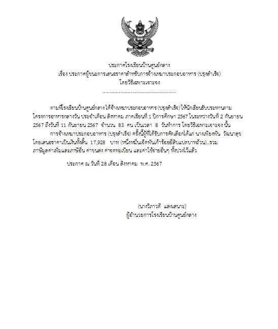 ประกาศผู้ชนะการเสนอราคาสำหรับการจ้างเหมาประกอบอาหาร โดยวิธีเจาะจง ประจำเดือน กันยายน งวดที่ 1 2567